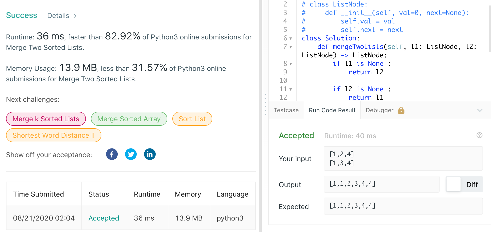 LeetCode 21. Merge Two Sorted Lists - Python