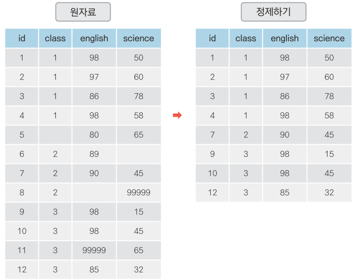 - 결측값이나 이상값을 꼭 제거해야 하는 것은 아니기 때문에 분석의 목적이나 종류에 따라 적절한 판단이 필요
