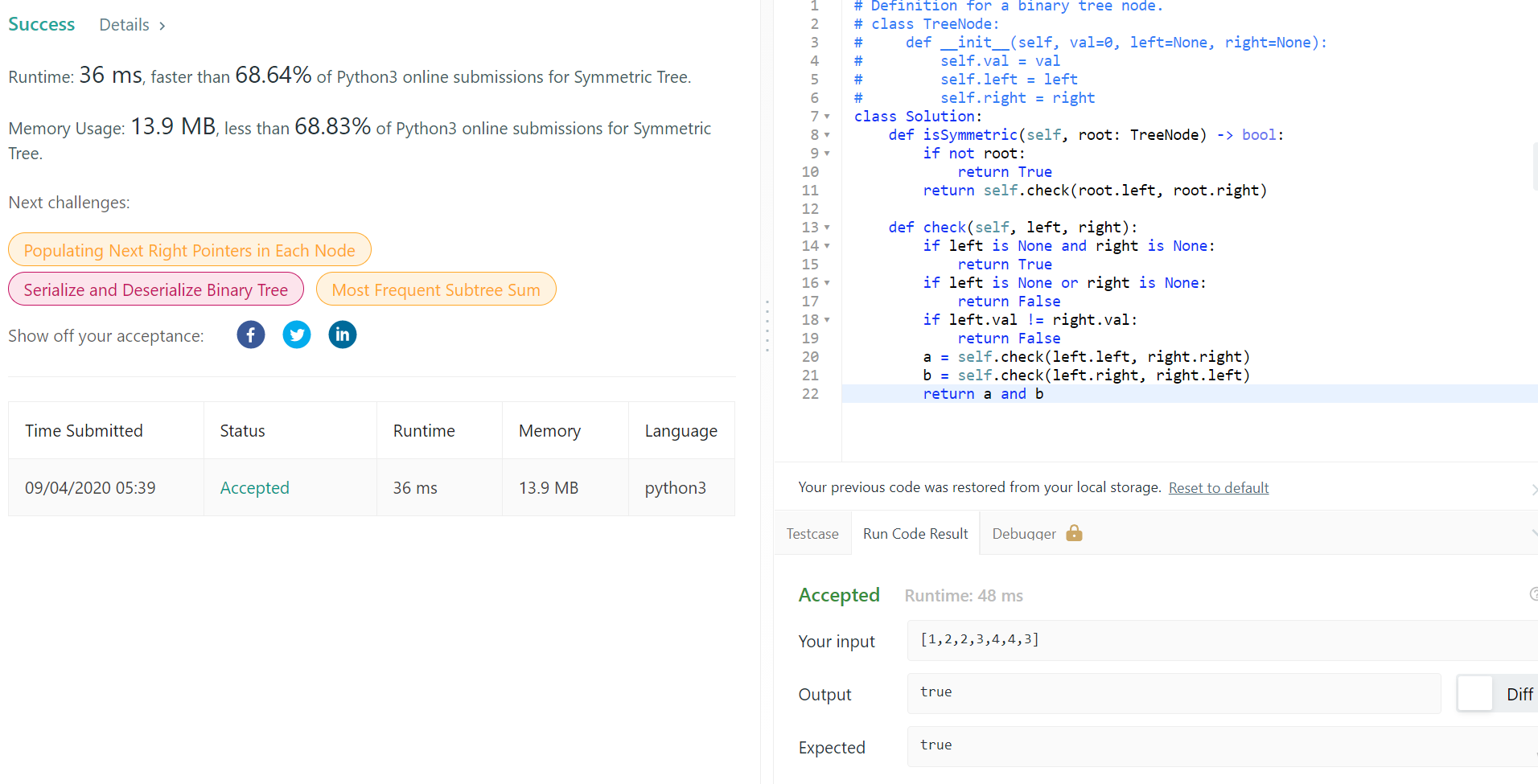 return self.check(root.left, root.right) #루트의 좌우 값 비교