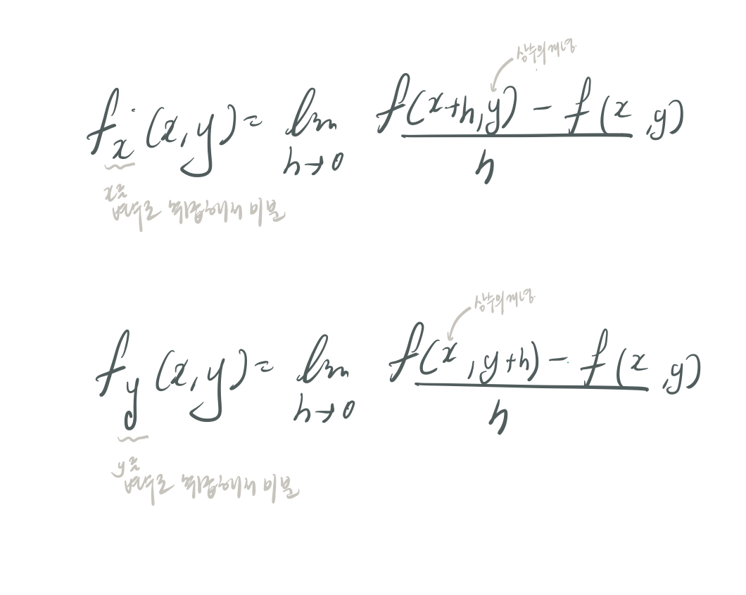 변수가 x,y 두 개인 함수에서 x만 미분할 경우 위와 같이 f뒤에 아래첨자를 적어 준다.