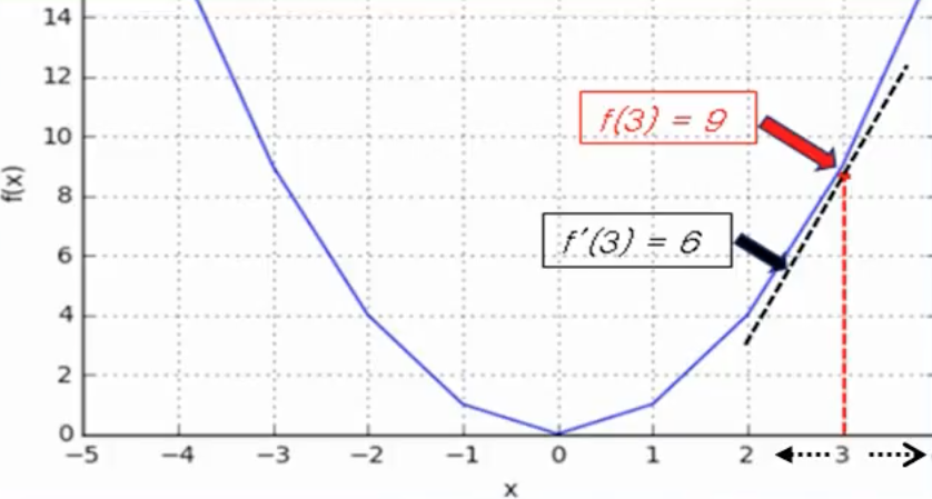 예를 들어 f(x) = x^2일 경우 이를 미분하면 f'(x) =2x이다. 위의 그래프에서 f(3) = 9이며, 이는 입력 x=3에서 출력은 9임을 의미한다. 그리고 f'(x) = 6이며, 입력 x = 3을 미세하게 변화시킬 때 함수의 현재 값의 2배인 6변화를 일으킴을 의미한다.