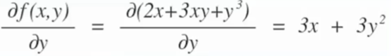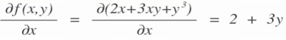 f(x, y) = 2x+3xy + y^3에서 변수 x에 대하여 편미분하면 아래와 같다.