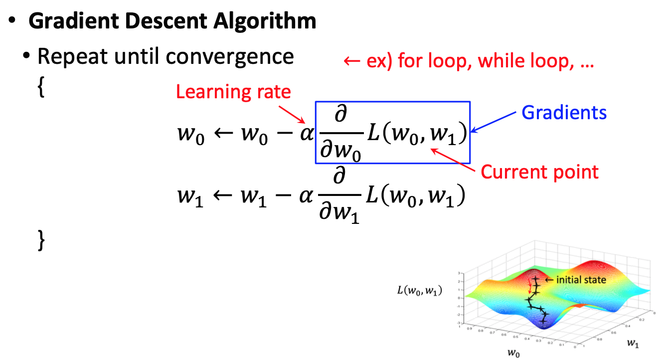 W0와 W1을 찾기 위해서 W0와 W1의 초기값을 설정을 한뒤에 반복 연산(예: for loop, while loop)을 돌린다. 새로운 W를 위해 현재 위치 W에서 Learning rate(알파)와 기울기를 뺀다. 'Gradient의 알파만큼 반대로 움직여라'는 것이며, 이를 경사하강법(Gradient Descent)이라고하 한다.