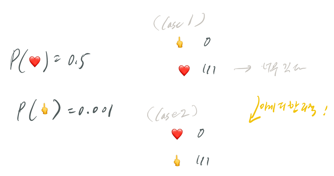 당연히 연인끼리 ❤️를 쓸 확률(0.5)이 훨씬 많으므로 ❤️가 더 짧게 표현되는 (Case2)가 더 효율적인 코딩이 될 것입니다.