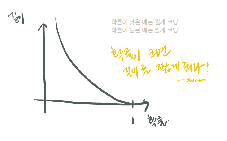 이와 같이 확률이 크면 길이를 짧게 주어야 한다는 것이 최소 평균 자원량으로 정보를 표현한다는 Entropy의 기본 개념입니다.