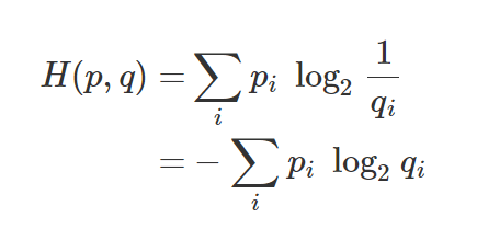 Entropy는 '실제' 최소 길이라고 하면 Cross Entropy는 '내가 생각한' 최소 길이이라고 생각하면 됩니다. 그래서 Cross Entropy의 수식에서는 로그 뒤에 pi를 qi로 바꿔 표현하게 됩니다. 수식은 아래와 같습니다.