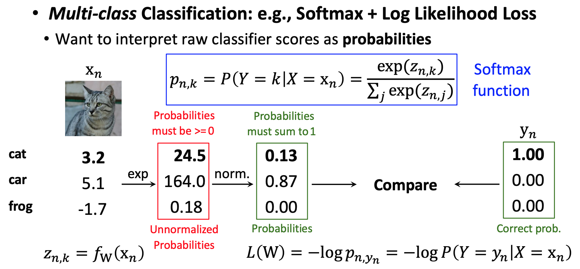 input parameter에 대한 우도를 평가하고 최대화하는 방법으로 cost function을 만들어냅니다. 입력 x와 그 정답 클래스의 쌍을 학습 데이터로 사용합니다. 그리고 일반적으로 Softmax classifier를 만들어내는 경우에는 정답 클래스를 one-hot encoding의 방법으로 학습시킵니다.
