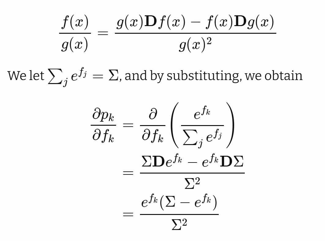 DΣ가 efk가 되는 이유는 만약 input array f를 softmax function에서 취하면 우리는 언제나 k번째 element의 미분값을 취하기 때문입니다. 이 경우에 k번째 element에 대한 미분은 (efk인 elements 내에서) 언제나 0이 됩니다.