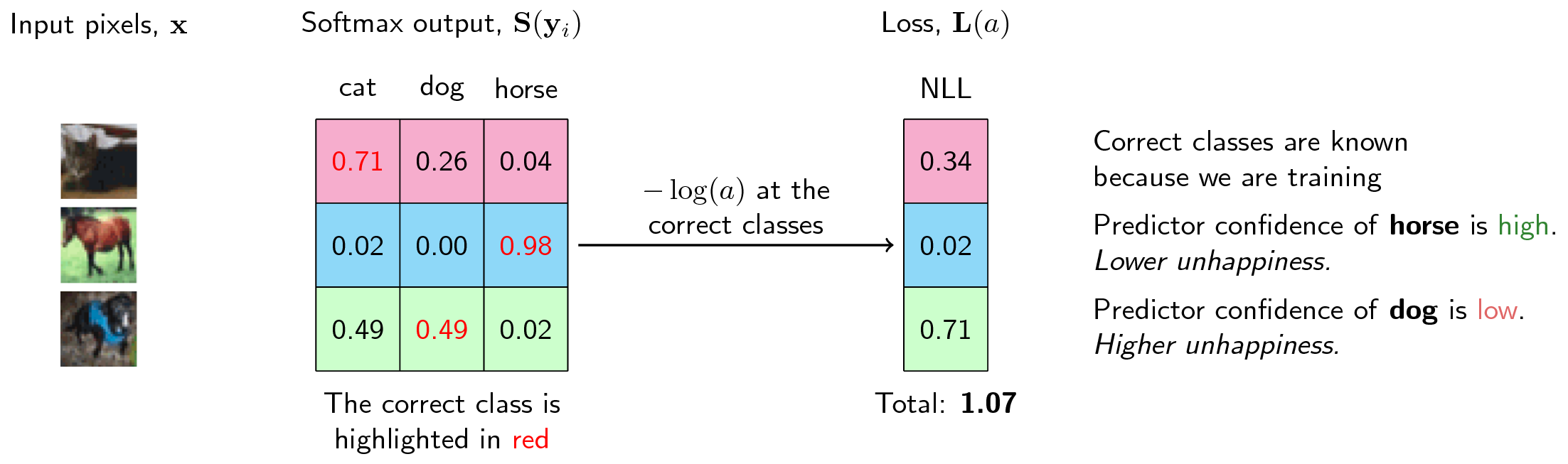 실제 softmax을 쓸 때는 negative log-likelihood(NLL)와 사용됩니다. 이 loss function은 softmax와 관계에서 굉장히 흥미롭습니다. 우선, 우리의 loss function은 아래와 같습니다.