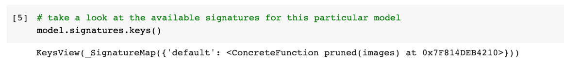 Tensorflow hub에 있는 model은 다양한 tasks를 위해 사용됩니다. 그래서 각 모델의 문서는 model을 실행할 때 무슨 signature가 필요한지 보여줘야 합니다. 우리는 이 실험에서 default signature만 사용할 것입니다.