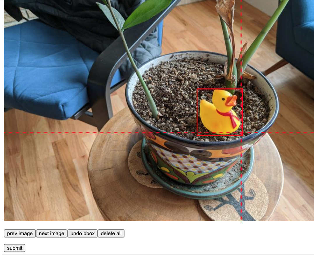 rubber duckies image 내 next image 를 box를 그린 뒤 더이상 이미지 없으면 submit 버튼을 누릅니다. 사전에 pre-annotated bounding boxes로 groundtruth를 prepopulation해놓은 다음 cell에서 진행해도 되니 skip하셔도 됩니다.