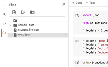 이제 이를 파일로 만들어보겠습니다. json.dumps를 쓰지만 만들때는 json.dump를 씁니다. 또한, indent = "\t"를 쓰지 않는다면 한 줄로 출력이 됩니다. 아래를 Colab 화면 보시면 파일이 만들어진 것을 볼 수 있습니다.