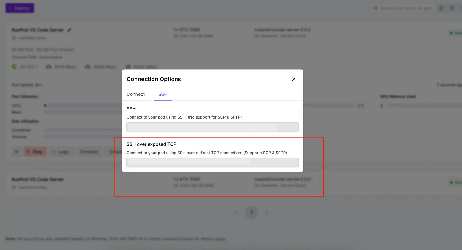 - In the Pod Dashboard, click Connect → Connection Options