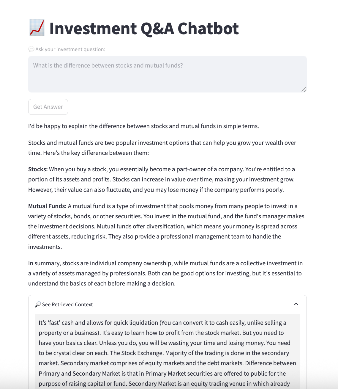 query = st.text_area("💬 Ask your investment question:", "What is the difference between stocks and mutual funds?")