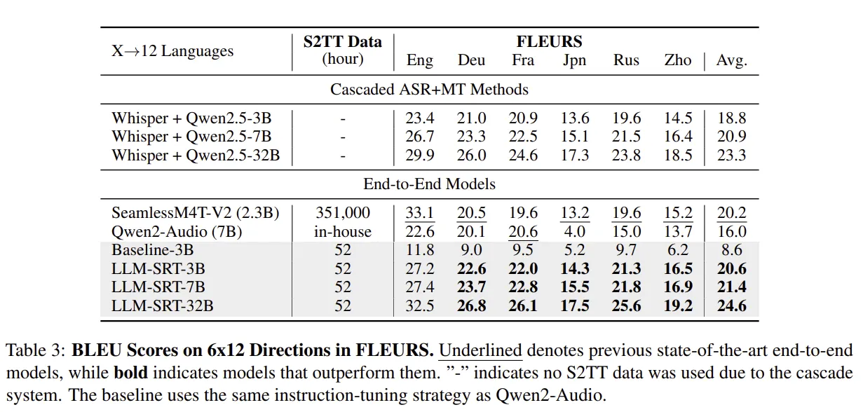 The paper trains 3B/7B/32B variants and evaluates across FLEURS (many-to-many) and CoVoST-2. The main headline: best average performance over 210 directions (15 languages) on FLEURS with under 10–12 hours per language; plus speed wins vs. a similar-size Qwen2-Audio baseline thanks to the 80-query adapter.