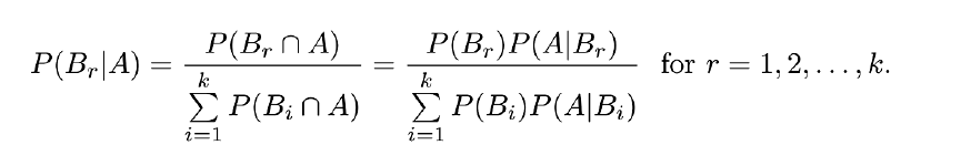 If the events B1, B2, ··· ,Bk constitute a partition of a sample space S and P(Bi) ≠ 0 for i = 1, 2, ··· , k, then for any event A in S such that P(A) ≠ 0