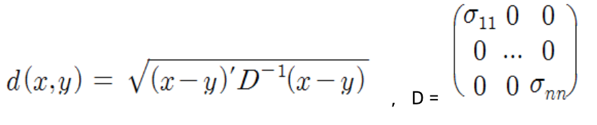 - 마할라노비스 거리: 통계적 개념이 포함된 거리, 변수들의 산포를 고려하여 표준화한 거리