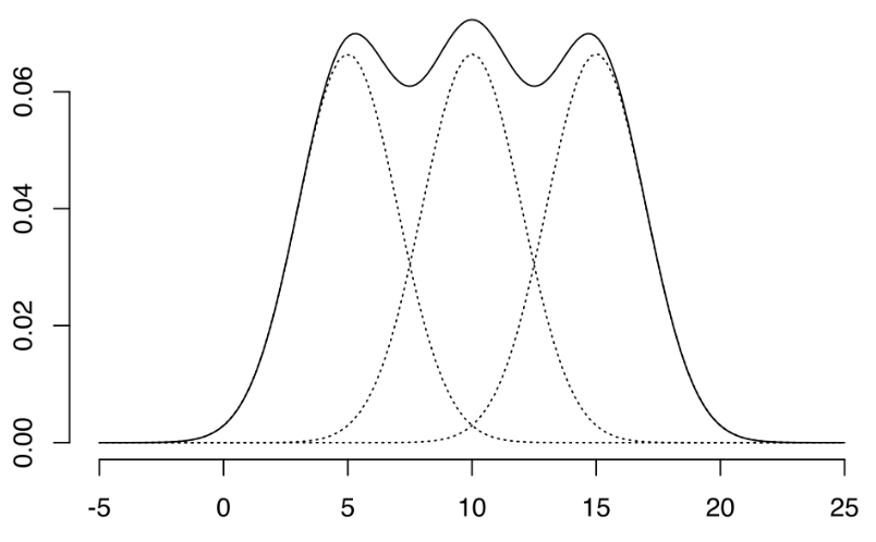 - 데이터가 k개의 모수적 모형(정규분포 혹은 다변량 분포를 가정)의 가중합으로 표현되는 모집단 모형으로 부터 나왔다는 가정하에서, 모수와 함께 가중치를 자료로부터 추정하는 방법