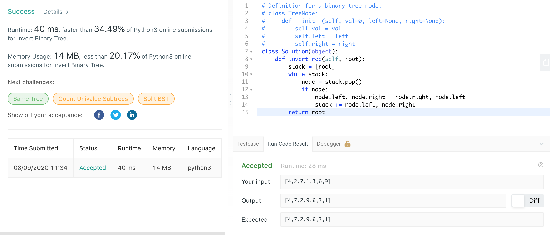 # root.left, root.right = self.invertTree(root.right), self.invertTree(root.left)