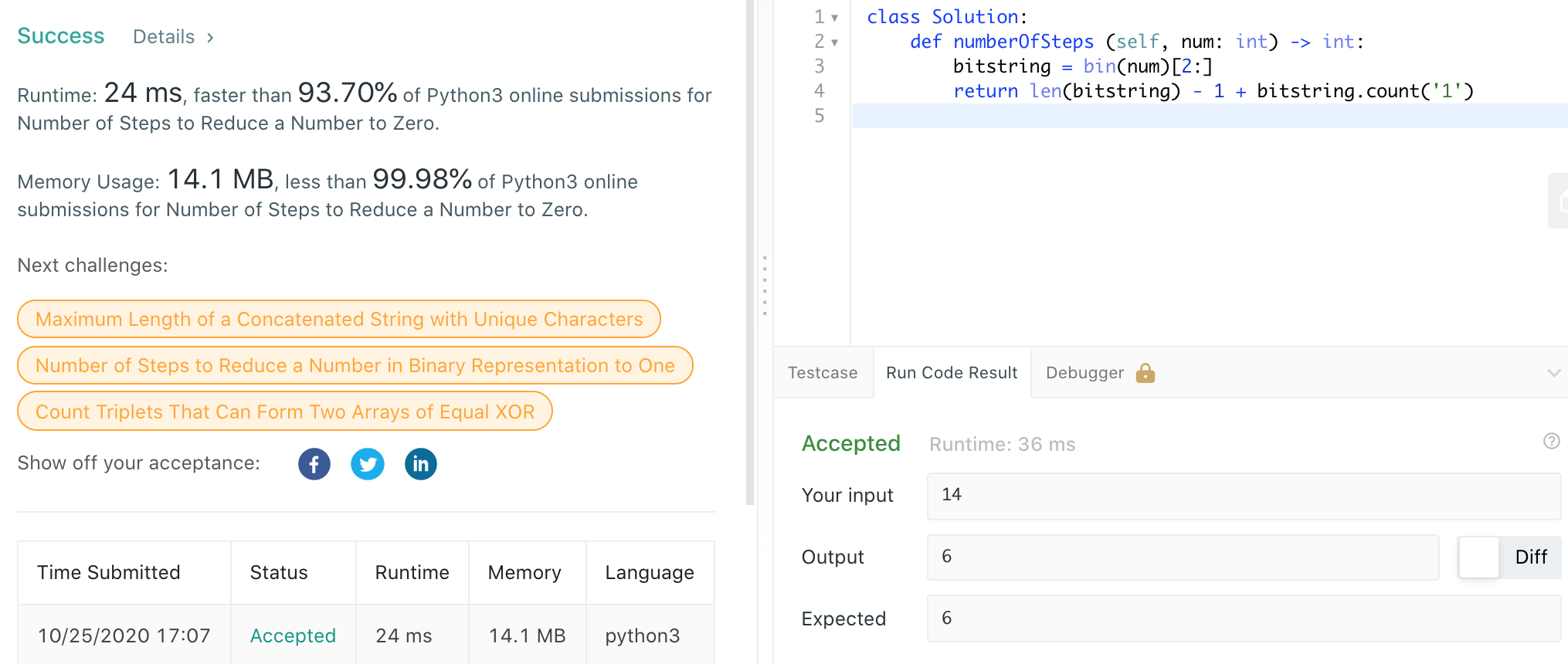 LeetCode 1342. Number of Steps to Reduce a Number to Zero - Python